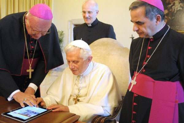 Bento XVI, garante seus colaboradores, sempre foi entusiasta de novas tecnologias. Já, inclusive, exortou aos padres fazerem uso da internet para evangelizar, dado o seu alcance instantâneo. Em julho do ano passado, o vimos empolgado e curioso, ao lidar com um tablet quando do lançamento do canal oficial de comunicação do Vaticano, o News.va, que é um atalho para todos os meios de comunicação da Santa Sé, jornal, sala de imprensa, emissoras de rádio e televisão e agências de notícias. Na inauguração do novo endereço, Bento XVI disse no primeiro “tweet” de um Papa: “Dear Friends, I just launched http://news.va. Praised be our Lord Jesus Christ! With my prayers and blessings, Benedictus XVI“. Em português: “Queridos amigos, acabei de lançar o http://news.va. Louvado seja Nosso Senhor Jesus Cristo! Com minhas orações e bênçãos, Bento XVI”.