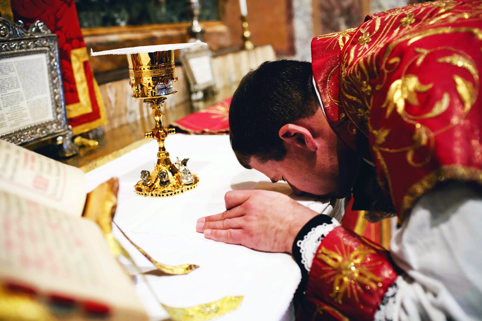Sacerdote beija o altar durante a oração do Cânon da Missa, segundo o rito antigo