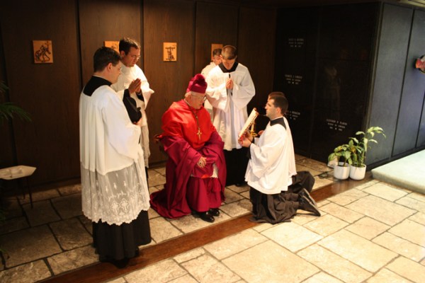 Depondo a mozzetta: Livrai-me, Senhor, do homem velho com as suas obras e costumes, e revesti-me do homem novo, criado segundo Deus na justiça e santidade da verdade.