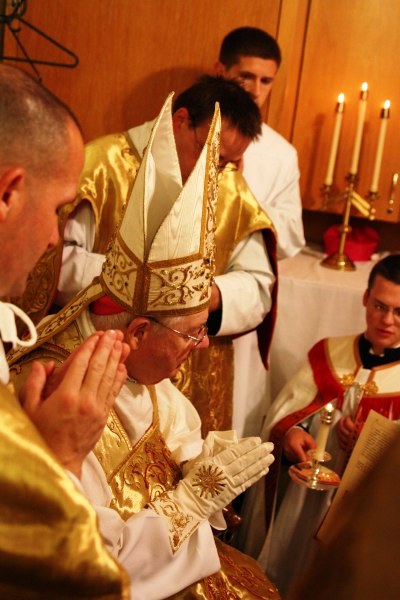 Ao impor a mitra: Imponde, Senhor, em minha cabeça a mitra e o capacete da salvação, para que não caia nas ciladas do antigo inimigo e de todos os demais adversários.