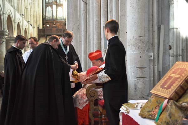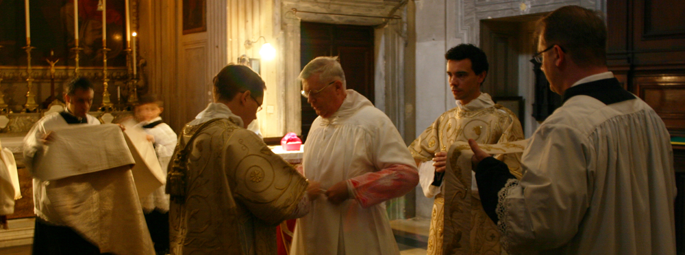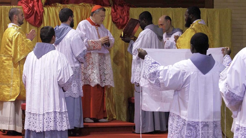 Cardeal Burke se paramenta com o auxílio de Franciscanos da Imaculada