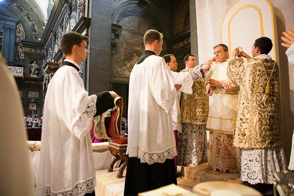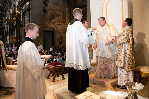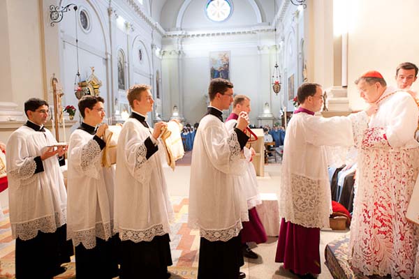 A fila de acólitos com as vestes pontificais para a paramentação do Cardeal Burke no altar