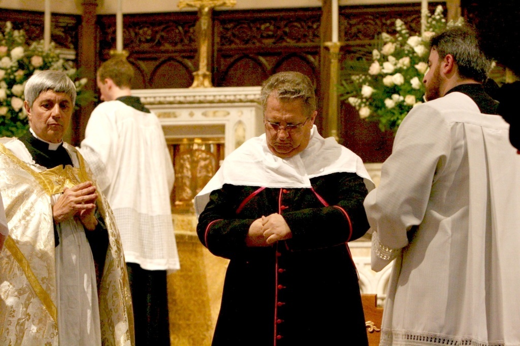 Sua Ex.cia Dom Fernando Rifan impõe-se o amito durante paramentação